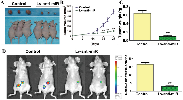 For experimental metastasis models, control and stable knockdown miR-93-3p cells (stable luciferase-transfected 786-O cells) were injected into the tail vein of nude mice. To monitor metastasis, tumors derived from stable luciferase-transfected 786-O cells were imaged to observe luciferase expression on day 28 after tumor cell injection. Briefly, the animals were anesthetized and then injected IP with luciferin at 150 mg/kg in a volume of 100 μL. Images were captured at a peak time of 15-20 min after injection using an IVIS-200 Imaging System (Xenogen Corporation, USA) and then processed using Living Image software. All animal procedures were approved by the Harbin Medical University Animal Committee.