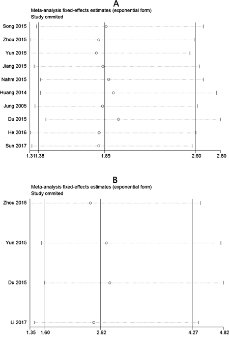 For testing the strength of our study, we performed a sensitivity analysis by alternately removing each study from the pooled analysis. The result were not obviously affected, indicating that our analyses should be reliable and stable (Figure 5).