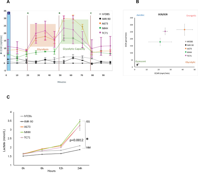 Figure 1: Metabolic profile of Ewing’s sarcoma cells. (A) ECAR rate was measured for EWS (A673, MHH, and TC71) and NM cells (hFOBS and IMR-90) in real-time using the Seahorse extracellular flux analyzer. A series of extracellular acidification rates (ECAR) were calculated showing basal glycolytic activity (orange block) and the maximum glycolytic capacity (green block). A, B, and C indicates injection of glucose, oligomycin and 2DG respectively. (B) OCR/ECAR ratio indicating dependence of cells on either mitochondrial respiration or glycolysis. Absolute values were obtained by seeding 30,000 cells/well. (C) Media at different time points from wells with 2x104 cells were collected to determine extracellular lactate level, lactate measurements showed significant increase at 72 hours compared to the NM cells. *p <0.05 was regarded as significant and calculated by comparing the means of the two groups with unpaired t test. Data represents the mean of three wells ± standard deviation.