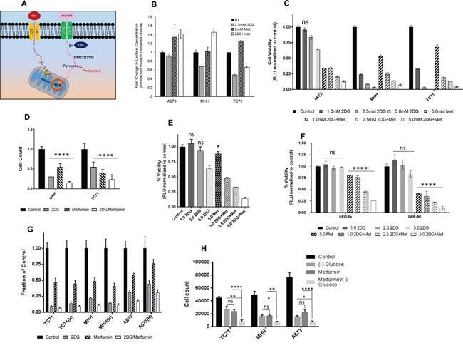 Figure 2: Targeting energy pathway by metabolic inhibition. (A) Schematic showing the two main pathways of glucose metabolism. (B) Effect of metabolic inhibition on lactate formation. Media after no treatment and 24 hours treatment with 2DG (2.5 mM) or metformin (5 mM) or a combination, was collected from wells with 2x104 cells to determine extracellular lactate level. Lactate measurements are shown as fold change over untreated control. (C) Effect of 2DG and Metformin on cell viability. EWS cells were treated for 3 days with varying concentrations of 2DG or metformin, alone or in combination. CellTiter-Glo was added and viability was measured at 72 hours. The results are expressed as relative fraction of viability compared with the corresponding untreated control group. Other than the indicated non-significant statistical difference (ns) all other treatment groups compared to the corresponding control was significantly different with p <0.0001. (D) Ewing sarcoma cells were treated for 3 days with 5 mM of 2DG, and 10 mM of metformin as single agents or in combination. Number of cells after treatment was quantified in situ with an image cytometer (Celigo). Data shown are means ± SD of 3 determinations. (E) PDX38 cell line, established from a EWS patient was used to see effect of metabolic inhibition on cell viability. Cells were treated for 3 days with indicated concentrations of 2DG and Metformin, alone or in combination. CellTiter-Glo was added and viability was measured at 72 hours. The results are expressed as relative fraction viability compared with the corresponding untreated control group. (F) Non-malignant cells, hFOBS and IMR-90 were treated for 3 days with indicated concentrations of 2DG, or metformin alone or in combination. (G) 2DG and metformin effects are independent of hypoxia. Cells were grown under normoxic conditions with 20% O2 or under 1% hypoxia for three days. Cells were left untreated or treated with either 2DG (5 mM), or metformin (10 mM) as single agents or in combination. Number of cells after treatment was quantified with in situ with an image cytometer (Celigo). (H) EWS cells either grown under normal culture condition with 25 mM glucose, or under glucose starved condition, were treated with 5 mM 2DG and 10 mM metformin either alone or in combination. Number of cells after treatment was quantified with in situ with an image cytometer (Celigo). Statistical significance of p <0.05 was calculated with two-way Anova with Dunnett’s multiple correction (* <0.05, ** <0.01, *** <0.001, **** <0.0001) with ns indicating non-significant. All data, unless otherwise indicated had p <0.0001 by Dunnett’s multiple comparison test, when compared to corresponding control.