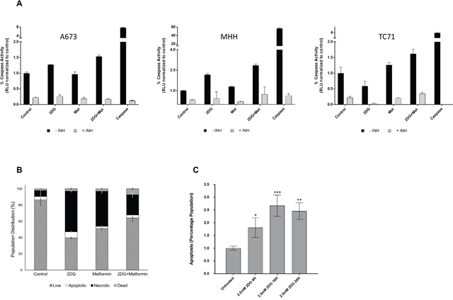 Figure 3: Metabolic inhibition induces apoptosis. (A) Caspase-3 activity was measured using lysates from untreated cells or cells treated with 2DG and/or metformin as described under Materials and Methods. Purified caspase-3 was used as positive control. Results show fold change over corresponding untreated control. (B) Flow cytometry analysis showing percentage of cells undergoing apoptosis and necrosis in untreated, 2DG (2.5 mM), metformin (5 mM) or metformin and 2DG treated cells. Cells stained only with Propidium iodide (PI) were gated as dead cells and Annexin V-positive cells were gated as apoptotic cells. Necrotic cells were quantified as both Annexin V and PI positive population, using a FACS analyzer. (C) Flow cytometry analysis showing induction of apoptosis in a time dependent manner when treated with 2.5 mM 2DG in MHH cells. Data shown are means ± SEM (n = 3).