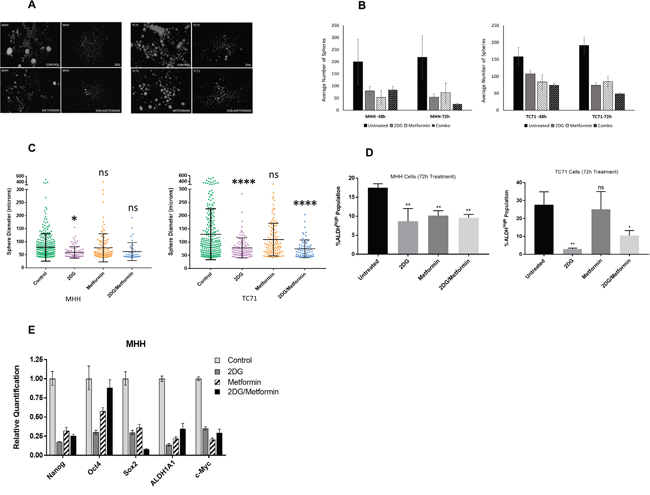 To test whether 2DG and metformin can target putative cancer stem cells in EWS, we first evaluated the effect on sarcosphere formation using either drug alone or in combination (Figure 5). Sarcosphere forming assay is a surrogate for self-renewal capacity in tumor cells. We observed that 2DG and metformin significantly reduced sphere number (Figure 5A & 5B) while 2DG was more effective in reducing the size (Figure 5C) of the spheres when compared to untreated cells. Metformin alone had a less profound effect, and the drug combination seemed to derive most of its effect from 2DG. To further explore the effect of metabolic inhibition on the stem cell population we assayed the change in ALDHhigh population in cells treated with either 2DG or metformin alone or in combination (Figure 5D). Like our previous observations, we found the most significant effect in the cancer stem cell compartment was with 2DG (2.5 mM) treatment for 72 hours. Additionally, to examine the effect of 2DG and metformin on cancer stem-like cells, we quantified the expression of genes associated with “stemness” including OCT-4, Nanog, Sox-2, ALDH1A, and c-Myc. Analysis of qPCR data in EWS cells showed that the expression level for all the genes went down significantly when treated with 2DG or metformin alone, or in combination (Figure 5E).