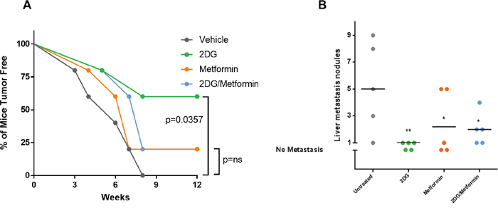 Figure 6: Pre-treatment with 2DG alone or in combination with metformin can delay tumor latency. Untreated cells or cells pre-treated with either 2DG (2.5 mM), metformin (5 mM), or combination for 72 hours were harvested and 50,000 cells were injected in the left tibia of 5 mice in each group. (A) Graph showing tumor latency in mice. Each dot represents one mouse reporting a palpable tumor at the site of injection at indicated time points. (B) Graph showing number of metastatic nodules in liver from each mouse estimated by gross observation. Each dot represents one mouse with number of nodules in the Y-axis. No tumor or no metastasis indicates mice that had either no palpable tumor or no liver metastasis respectively. All statistical comparison was done pair-wise by comparing control group to each of the treated group using one-way Anova, with no multiple correction. NS indicates no significant difference, while p <0.05 was considered statistically significant and indicated with a *, and p = <0.01 with **.