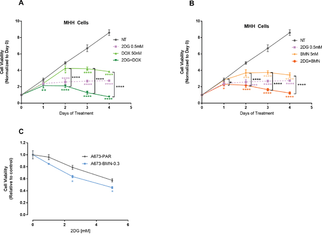 Figure 7: 2DG can enhance chemosensitivity. MHH cells were treated for 0-96 hours and viability was measured at indicated time points. (A) Cells were either untreated or treated with 2DG or Doxorubicin alone or in combination. (B) Cells were either left untreated or treated with 2DG or BMN alone or in combination. Data was normalized to cell viability reading from day 0. (C) PARP-i resistant cells are sensitive to 2DG mediated inhibition. Parental (A673) and the PARP inhibitor, BMN 673 (Talazoparib) resistant (A673-BMN) A673 cells were treated for 3 days with varying concentrations of 2DG. CellTiter-Glo was added and viability was measured at 72 hours. The results are expressed as relative fraction viability compared with the corresponding untreated control group. Data shown are means ± SD of 4 determinations. Pairwise comparisons using one-way Anova with Dunnett’s multiple comparison test is shown in the figure (p * <0.05, ** <0.01, *** <0.001, **** <0.0001). Comparison of control to treated groups individually are indicated in asterisk with corresponding color while comparison between two treated groups are shown in black.