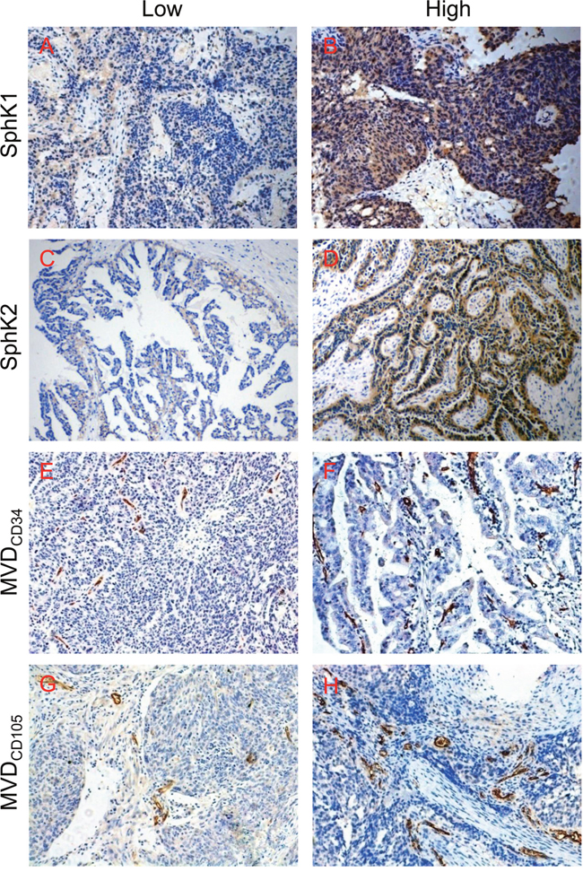 Figure 1: Immunohistochemical staining of SphK1, SphK2, CD34 and CD105 in epithelial ovarian cancer tissues. (A) Low SphK1 expression; (B) high SphK1 expression; (C) low SphK2 expression; (D) high SphK2 expression; (E) low MVDCD34 area; (F) high MVDCD34 area; (G) low MVDCD105 area; (H) high MVDCD105 area. Magnification, 200× (A–H).