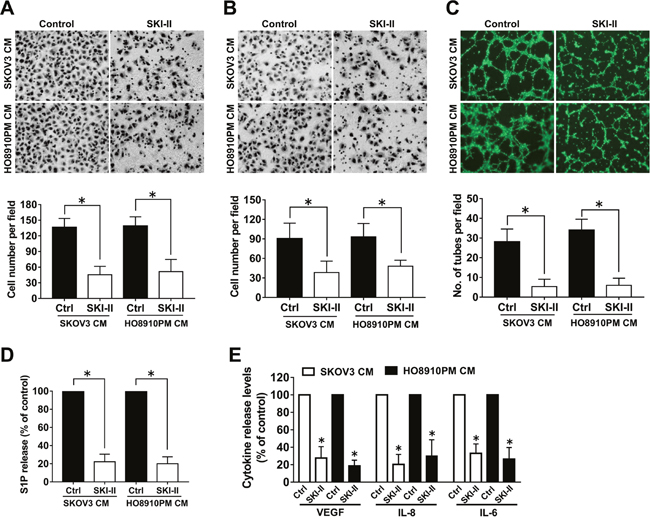 Figure 2: Effect of SphK inhibition by SKI-II on angiogenesis in vitro. (A) Cell migration assay. Endothelial cells were stimulated with the culture media (CM) collected from the ovarian cancer cells precultured with or without SKI-II (2.5μM). The migrated cells were stained, photographed and counted. (B) Cell invasion assay. Endothelial cells were stimulated with CM, the invaded cells were photographed and counted. (C) Tube formation assay. Endothelial cells suspended in CM were placed on the matrigel to form tube like structures, which were then photographed and quantificated. (D) Effect of SKI-II on the S1P secretion of ovarian cancer cells. (E) Effect of SKI-II on the VEGF, IL-8 and IL-6 secretion of ovarian cancer cells. All experiments were repeated three times, with three replicates in each group (* p<0.05 vs. Control group).