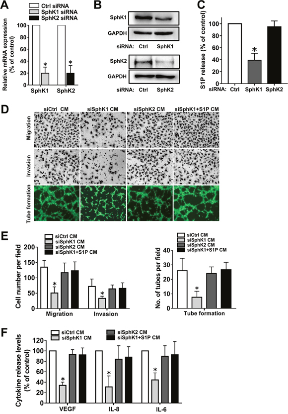 Figure 3: Effect of SphK1 or SphK2 blockage on angiogenesis in vitro. (A) SKOV3 cells were transfected with control-siRNA, SphK1-siRNA or SphK2-siRNA. Expression of SphK1 or SphK2 mRNA levels were determined by PCR and normalized to GAPDH mRNA. (B) Protein levels of SphK1 and SphK2 were determined by western blot. (C) S1P levels in the culture media (CM) from siRNA transfected cells were determined by ELISA. (D) Representative images of the migration, invasion and tube formation assays. Endothelial cells were stimulated with the CM collected from siRNA transfected cells with or without S1P (1μM) addition. Migrated cells, invaded cells and tube like structures were photographed. (E) Statistical analysis of the migrated cells, invaded cells and tube like structures. (F) Effect of siRNA transfection with or without S1P addition on the VEGF, IL-8 and IL-6 secretion of ovarian cancer cells. All experiments were repeated three times, with three replicates in each group (* p<0.05 vs. Control group).
