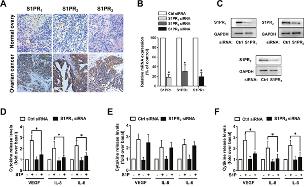 Figure 4: S1PR1 and S1PR3 mediate S1P-induced VEGF, IL-8 and IL-6 expression. (A) Immunohistochemical staining of S1PR1, S1PR2 and S1PR3 in human normal ovarian tissue and ovarian cancer tissue. (B) SKOV3 cells were transfected with control-siRNA, S1PR1-siRNA, S1PR2-siRNA or S1PR3-siRNA. Expression levels of S1PR1, S1PR2 and S1PR3 were determined by PCR and normalized to GAPDH mRNA. (C) S1PR1, S1PR2 and S1PR3 proteins were determined by western blot. (D) Effects of S1PR1-siRNA on VEGF, IL-8 and IL-6 secretion in response to S1P treatment. (E) Effects of S1PR2-siRNA on VEGF, IL-8 and IL-6 secretion in response to S1P treatment. (F) Effects of S1PR3-siRNA on VEGF, IL-8 and IL-6 secretion in response to S1P treatment. All experiments were repeated three times, with three replicates in each group (* p<0.05 vs. Control group).
