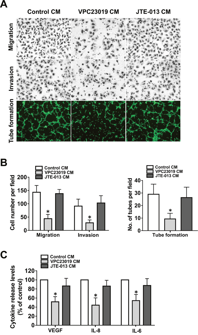 Figure 5: Effect of S1PR1-3 inhibition on angiogenesis in vitro. (A) Representative images of the migration, invasion and tube formation assays. Endothelial cells were stimulated with CM collected from the ovarian cancer cells precultured with VPC23019 (300nM) or JTE-013 (1μM). Migrated cells, invaded cells and tube like structures were photographed. (B) Statistical analysis of the migrated cells, invaded cells and tube like structures. (C) Effect of VPC23019 and JTE-013 on the VEGF, IL-8 and IL-6 secretion of ovarian cancer cells. All experiments were repeated three times, with three replicates in each group (* p<0.05 vs. Control group).