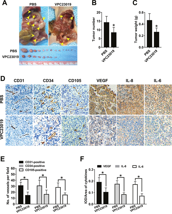 Figure 7: Effect of S1PR1/3 blockage on angiogenesis in vivo. (A) Representative images of disseminated tumors in intraperitoneal ovarian cancer xenograft model treated with PBS (n=8) or VPC23019 (n=8). Tumor number (B) and tumor weight (C) were quantificated. (D) Immunohistochemical staining for CD31, CD34, CD105, VEGF, IL-8 and IL-6 was performed. (E) The number of CD31-positive, CD34-positive or CD105-positive vessels was quantificated. (F) Statistical analysis of IOD/area of VEGF, IL-8 and IL-6 (* p<0.05 vs. PBS group).
