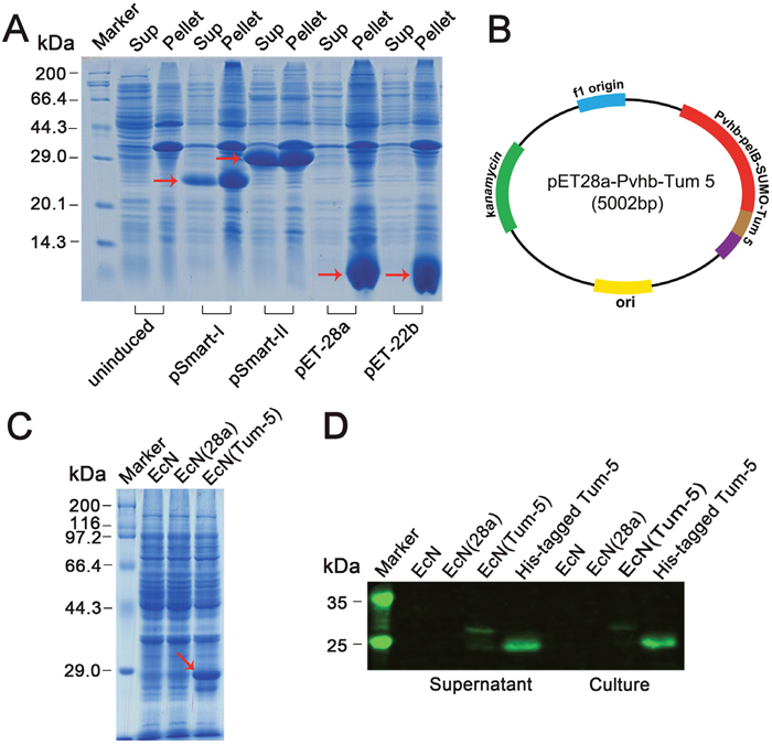 Figure 1: Characterization of Tum-5 expression in vitro. (A) Coomassie Brilliant Blue staining of SDS–PAGE showing Tum-5 expression in E.coli BL21 (DE3). (B) Map of recombination plasmid containing Tum-5 gene. (C) SDS–PAGE analysis of Tum-5 expression in EcN, EcN (28a), and EcN (Tum-5). (D) Western blot analysis of Tum-5 expression in cell lysates (supernatants) or culture supernatants of EcN, EcN (28a), and EcN (Tum-5).