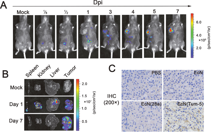 Figure 2: Colonization profile of EcN in the murine B16 tumor model and characterization of Tum-5 expression in vivo. 1×105 B16F10 cancer cells were inoculated into the right axillary subcutaneous of C57BL/6 mice. After 7–10 days, the mice were injected with 5×106 CFU/100 μl EcN (Lux). (A) The distribution of the bacteria in the tumor-bearing mice were detected using IVIS. (B) The tumor, liver, kidney, and spleen of the mice were isolated at different times and observed using IVIS. (C) Tum-5 was confirmed to be successfully expressed in the tumor tissue by IHC (200×) using its specific antibody. Almost no positive signal was observed in tumor sections in the PBS-, EcN-, EcN (28a)-treated mice. “Dpi” means “days post infection.”