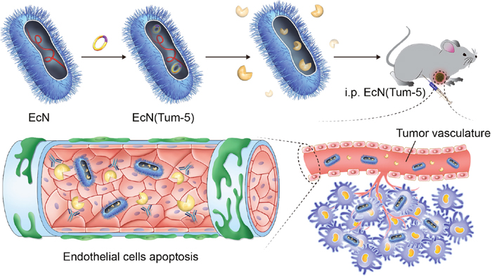 In this study, the anti-tumor effect of EcN (Tum-5) on the mice bearing B16 mouse melanoma has been investigated in vivo. The engineered bacterium efficiently suppressed the growth of tumors by releasing Tum-5 protein and inhibiting tumor angiogenesis in vivo. This work laid an important foundation for bacteria-mediated tumor therapy.