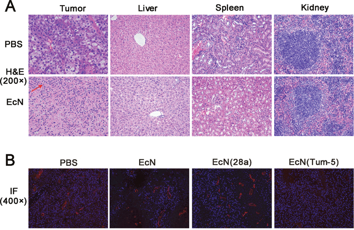 Figure 5: HE staining of tumor tissue sections and immunofluorescence of CD31 expression in vivo. H&E staining (400×) of the tumor sections was used to observe biopsy pathological morphology (A). IF staining (200×) for DAPI-stained nuclei (blue), CD31 (red) were evaluated by fluorescence microscopy (B). Positive signals were hardly observed in the tumor sections of EcN (Tum-5)-treated mice.