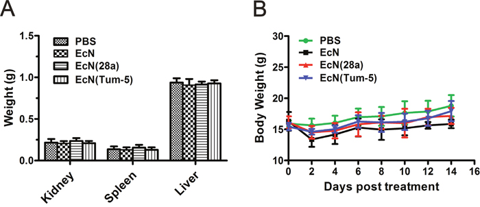 Figure 6: Body weight and kidney, spleen, and liver weight changes of mice before or after bacterial treatment. Mice bearing B16 mouse melanoma were injected every 6 days with 5×106 CFU/100 μl EcN, EcN (28a), EcN (Tum-5), or sterilized PBS three times. At the end of the experiment, the kidney, liver, and spleen were excised and weighed (means and SDs) (A). The body weights were recorded at 2-day intervals. (B) No significant difference was observed between the PBS and EcN treatment groups.