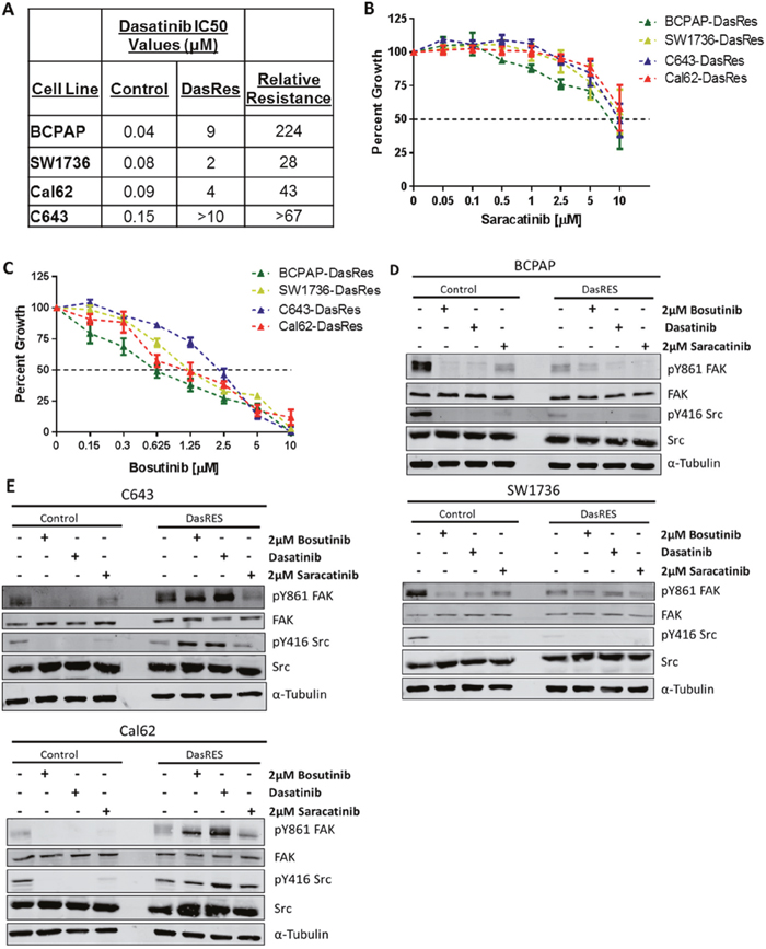 Our lab and others have previously identified Src as a key mediator of thyroid cancer cell growth, invasion, and metastasis [12–14, 16, 17]. We have also shown that inhibition of Src with two ATP competitive Src inhibitors, saracatinib and dasatinib, reduces thyroid cancer cell and tumor growth [13]. Furthermore, we have shown that these responses are due to Src activity, as introduction of the drug-resistant c-Src gatekeeper mutant abrogates response to dasatinib [13]. In addition to thyroid cancer, Src has been previously identified as an important mediator of cancer cell growth, survival, invasion, and metastasis, in a variety of cancers such as breast and lung cancer [15, 18–22]. However, despite promising pre-clinical data in thyroid and other cancers, Src inhibitors have not been as successful in solid tumor clinical trials as expected [23–25]. In order to further understand the mechanism(s) underlying this limited response; we previously generated 4 dasatinib-resistant (DasRes) cell lines, which were chronically treated with dasatinib, and investigated potential mechanisms of resistance in order to identify targets for upfront combination therapies [16]. Alongside, we generated DMSO treated control cell lines to account for any changes chronic DMSO treatment would have on the DasRes cell lines. We have successfully used this approach to identify a key role for the MAP kinase pathway, which has provided the framework for a future Src and MEK inhibitor combination clinical trial [16].