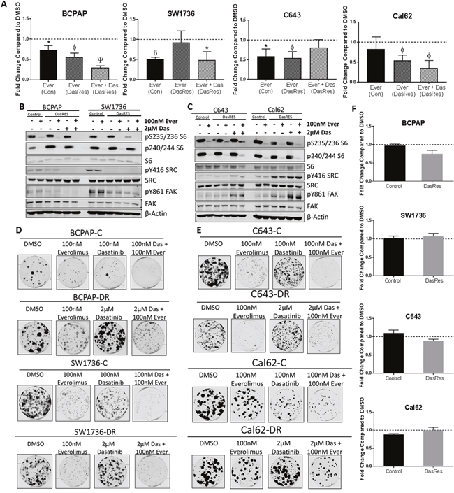 Indeed, inhibition of mTOR using everolimus resulted in a 50% reduction in cell growth (Figure 3A) and over 50% reduction in colony growth (Figure 3D–3E, Supplementary Figure 3C–3D), which correlated with >90% inhibition of phospho-S6 (Figure 3B–3C, Supplementary Figure 3A–3B). Interestingly, this reduction in cell growth was not due to an increase in apoptosis, as we did not observe any increase in cleaved caspase 3/7 (Figure 3F). Taken together, we conclude that mTOR is an important promoter of control and DasRes cell growth and colony formation. Although we did not observe any induction of apoptosis, we cannot completely rule out the role mTOR plays in promoting cell death. It has previously been shown that inhibition of the AKT/mTOR and MAPK pathways can induce autophagy [69, 70]. mTOR is a negative regulator of autophagy, so inhibition of mTOR could induce autophagy, and this may be why we do not observe an induction of apoptosis in response to everolimus. However, further investigation is needed to understand the effects of mTOR inhibition on autophagy and apoptosis in thyroid cancer.
