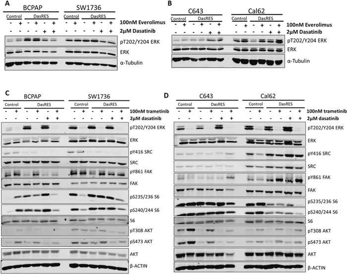 To determine if the opposite could also occur, we first treated the control and DasRes cells with the MEK1/2 inhibitor, trametinib, to assess signaling changes in the MAPK and AKT/mTOR pathways. As expected, we observed a 95% reduction in phospho-ERK, pT202/Y204, upon trametinib treatment in the BRAF-mutant (BCPAP; SW1736) and RAS-mutant (C643; Cal62) control cell lines (Figure 4C–4D, Supplementary Figure 4C–4D), and accordingly, a reduction in pY861-FAK and pY416-SRC in the BRAF-mutant DasRes cell lines (BCPAP; SW1736) when maintained in dasatinib (Figure 4C, Supplementary Figure 4C). Interestingly, we observed an increase in AKT phosphorylation in three of the control and DasRes cell lines (BCPAP; C643; Cal62); suggesting the AKT/mTOR pathway is upregulated to compensate for MAPK inhibition. This has previously been observed in other tumor models [42, 51–53].