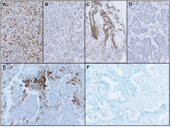 Figure 1: Representative histologic images of MLH1 (A, preserved; B, lost), MSH2 (C, preserved; D, lost) and PD-L1 (E, positive; F, negative) staining used in analysis of 430 patient with solid tumors.