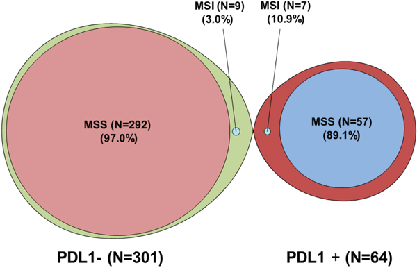 Figure 2: Graphical representation showing the overlap between PD-L1 status and MMR status (MLH1/MSH2) among a cohort of 365 solid tumors available for both PD-L1 status and MMR status (MLH1/MSH2). Among PD-L1+ samples there is enrichment for dMMR (MSI) when compared to PD-L1- samples.