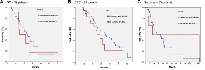 Figure 3: Impact of PD-L1 and MLH1/MSH2 IHC status on overall survival (OS) among cohorts of GC (A), CRC (B), and sarcomas (C) who had received all standard of care therapies.