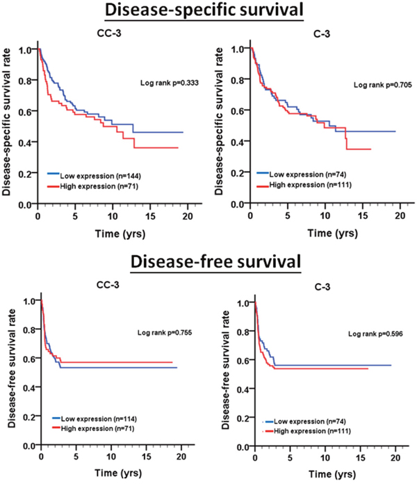 Initially, an oral cancer pathologist (Dr. Ting-Ying Fu) accompanied by two pathology technicians evaluated the slides until all discrepancies were resolved. Subsequently, the two pathology technicians independently reviewed the slides except the cores with incorrect or uncertain contents, which were scored by the pathologist. During the evaluation, both of them were blinded to the clinical outcomes of the patients. The immunoreactivity was graded by a semiquantitative approach. Marker scores for cytoplasmic staining of cleaved caspasp-3 and caspase-3 were calculated based on staining intensity (-, negative; +, weak; ++, moderate; and +++, strong) and percentage of cells staining at each intensity level [0 (<5%), 1 (5-25%), 2 (26-50%), 3 (51-75%), and 4 (>75%)]. The intensity score and percentage of positive cells were then multiplied to produce the final scores (0-7). For survival analysis, the protein expression was dichotomized as negative/low expression (≤ the cutoff point) and positive/high expression (> the cutoff point) with the cutoff point set at the 25th percentile based on the distribution of the protein score. The cutoff values were 0 and 4 for cleaved caspase-3 and caspase-3 in BMSCC tissues, respectively. Moreover, the cutoff value of 0 was defined as negative expression, and the cutoff value of >0 was defined as positive expression for cleaved caspase-3. Based on the distribution of all cleaved caspase-3 (CC-3) and caspase-3 (C-3), setting the cutoff at 25% can yield relatively even distribution and enough patient number in each group (positive/high and negative/low expression groups; Supplementary Table 6).