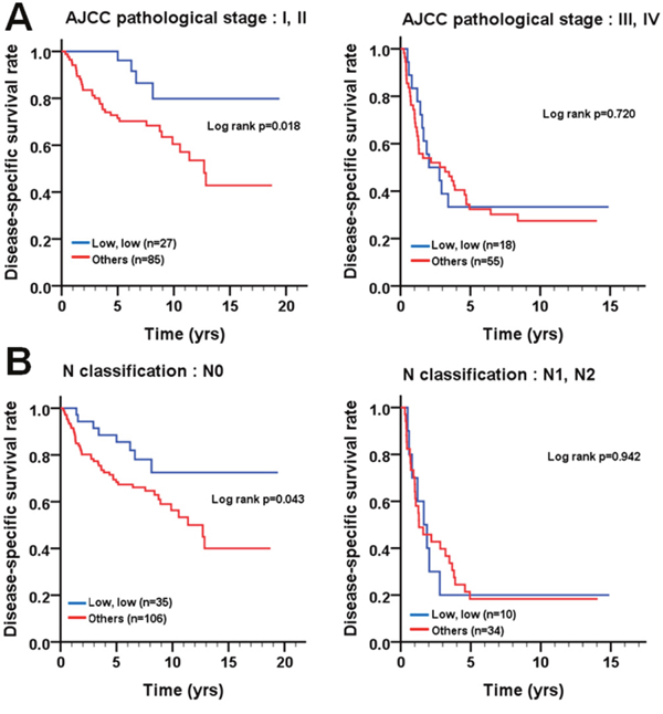 Figure 5: Survival curves depicting DSS of BMSCC patients according to the co-expression pattern of cleaved caspase-3 and caspase-3 stratified by (A) AJCC pathological stage (I + II and III + IV) and (B) lymph node invasion (N0 and N1 + N2).