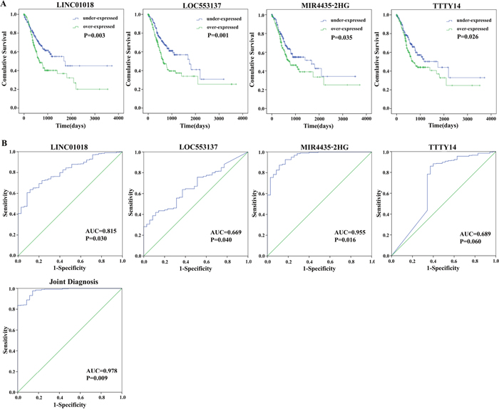 The findings of this study may have substantial clinical significance; however, some limitations should be taken into consideration. First, we identified the target lncRNAs by using tumor stage of GC, but tumor metastasis was not included. Second, the data extracted from TCGA were based on the RNA-Seq technique; other experimental methods are required to verify the results. Third, the role of LINC01018, LOC553137, MIR4435-2HG, and TTTY14 in GC are still unknown; in vivo and in vitro experiments are expected to answer this question.
