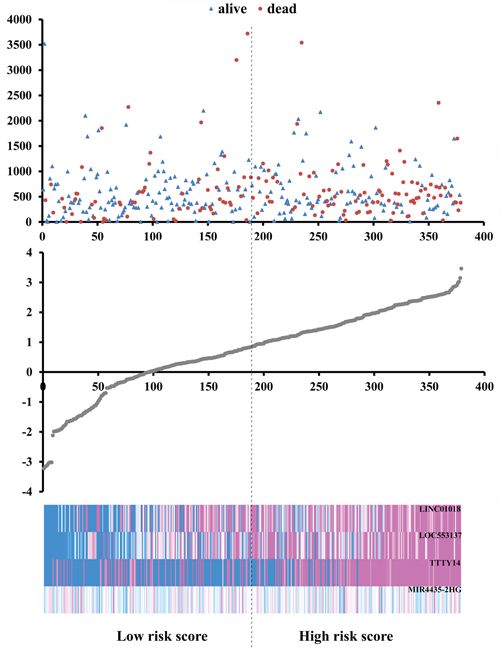 Although TCGA database has been used to analyze the lncRNA-related signature for GC prognosis [27], compared with previous studies, the advantage of this study was the combination of clinical features and TCGA data and assessed the survival of GC patients by constructing a risk score that associated with lncRNAs. Based on this, the four novel lncRNAs (LINC01018, LOC553137, MIR4435-2HG, and TTTY14) have the reason to be a new risk factor. Besides, the risk score constructed from these four lncRNAs could be served as a prognostic indicator for GC patients.