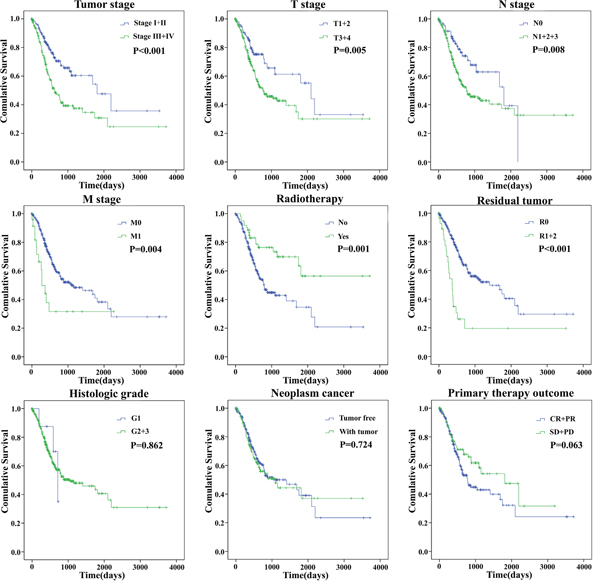 Figure 6: The prognostic value of different clinical features for overall survival of gastric cancer patients. Kaplan-Meier curves of seven independent prognostic indicators. SD, stable disease; PD, progressive disease; CR, complete remission; PR, partial remission.