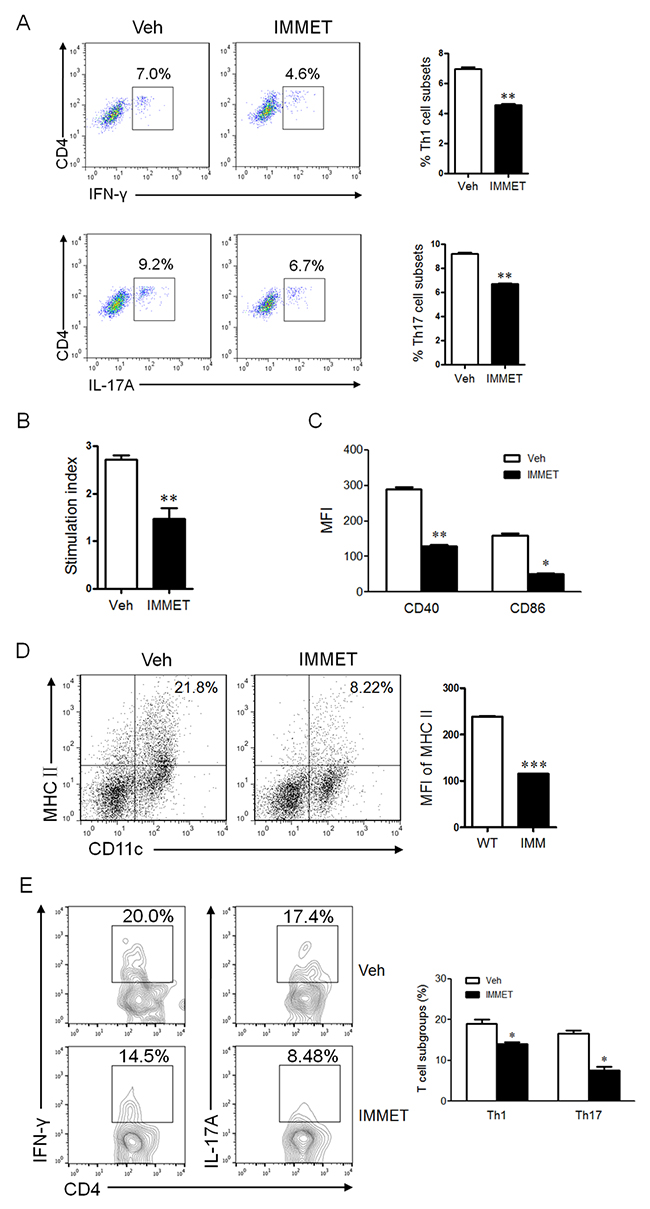 Figure 2: The treatment of immethridine could affect the differentiation and function of immune cells in EAE mice. (A) FACS analysis of CD4+ T cell subsets in splenocytes of EAE mice (n=6). Splenocytes were prepared and Th1 and Th17 cells were analyzed by intracellular staining of IFN-γ and IL-17A, respectively, in the CD4+ gate. *p<0.05, **p<0.01 versus vehicle. (B) MTT analysis of MOG35-55-specific T cell proliferation. Splenocytes of EAE mice (n=6) were isolated and cultured at the present or absent of MOG35-55 peptides for 72h and T cell proliferation was measured using a MTT Cell Proliferation Assay Kit. The data were shown at stimulation index. **p<0.01 versus vehicle. (C) FACS analysis of expression of co-stimulatory molecules on DCs in splenocytes of EAE mice (n=6). Splenocytes were prepared and stained with fluorescent labeled-antibodies against CD11c, CD40 or CD86, the stained cells were analyzed on flow cytometry. *p<0.05, **p<0.01 versus vehicle. (D) FACS analysis of expression of MHCII on DCs in spinal cord of EAE mice (n=6). Immune cells in spinal cord were prepared and stained with fluorescent labeled-antibodies against CD11c, MHCII, the stained cells were analyzed on flow cytometry. ***p<0.001 versus vehicle. (E) FACS analysis of CD4+ T cell subsets in spinal cord of EAE mice (n=6). The lymphocytes from spinal cord were prepared and Th1 and Th17 cells were analyzed by intracellular staining of IFN-γ and IL-17A, respectively, in the CD4+ gate. *p<0.05 versus vehicle. Data are representative of three independent experiments.