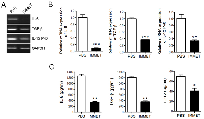 Figure 3: Immethridine could inhibit the cytokine secretion in BMDCs. BMDCs were prepared and stimulated with immethridine (1 μM) and LPS (100 ng/ml) in 24-well plates for 6h. The total mRNAs were extracted and the transcription level of the cytokines was detected by RT-PCR (A) and Q-PCR (B), respectively. The culture supernatant was collected and the protein level of the cytokines was measured by ELISA (C). *p<0.05, **p<0.01, ***p<0.001 versus PBS. Data are representative of three independent experiments.