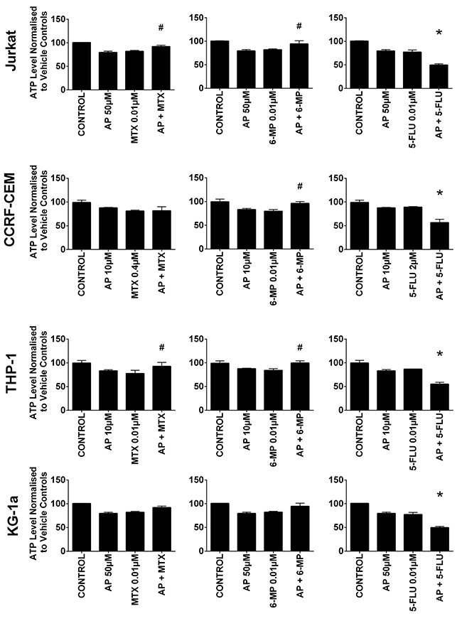 Figure 2: The effect of methotrexate (MTX), 6-mercaptopurine (6-MP) and 5-fluorouracil (5-FLU) when used in combination with apigenin (AP) on ATP levels: in two lymphoid (Jurkat and CCRF-CEM) and two myeloid (THP-1 and KG-1a) leukemia cell lines, evaluated by CellTiter-Glo® assay. Cells were treated with MTX, 6-MP or 5-FLU and apigenin alone and in combination for 24 hr using their lowest-significant doses (LSD); together with a vehicle control. All data was normalised to the vehicle control which was assigned 100% cell viability. The data was expressed as medians and ranges (n=4). Effects of combination treatments were statistically classified as synergistic (*) causing a decrease in ATP levels or antagonistic (#) causing an increase in ATP levels; when compared to vehicle control, drugs alone and expected values of combination treatments. Statistical significant was set at P≤0.05.