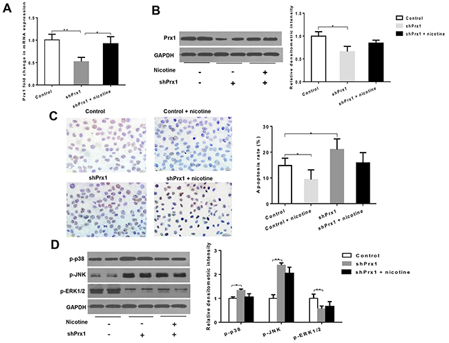 Figure 1: Nicotine increases expression of α3nAChR, α7nAChR and Prx1, and inhibits apoptosis in DOK cells. (A) mRNAexpression of α3nAChR, α7nAChR and Prx1; (B) protein expression of α3nAChR, α7nAChR and Prx1; (C) apoptosis rate detected by TUNEL; and (D) phosphorylation of p38, JNK and ERK1/2. The values are expressed as mean; bars, ± SE. * P < 0.05; ** P < 0.01.