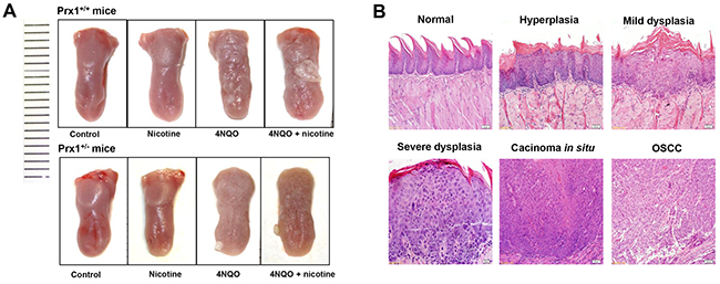 Figure 4: Histopathology of mouse tongue in animals treated with nicotine, 4NQO or ANQO plus nicotine. (A) the representative images of entire tongue collected from Prx1 wild-type and Prx1 knockdown mice; and (B) the representative H&E staining of mouse tongue including normal, hyperplasia, dysplasia, carcinoma in situ and OSCC (magnification x 200).
