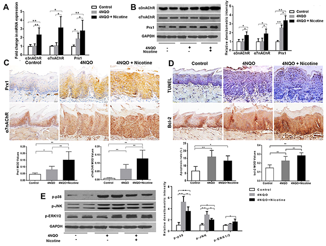 Figure 5: Effects of 4NQO and 4NQO + nicotine on Prx1, α3nAChR, α7nAChR, apoptosis and MAPK in Prx1 wild-type (Prx1+/+) mice. (A) mRNAexpression of α3nAChR, α7nAChR and Prx1; (B) protein expression of α3nAChR, α7nAChR and Prx1; (C) expression of Prx1 and α7nAChR detected by IHC; (D) apoptosis detected by TUNEL and Bcl-2 expression; (E) phosphorylation of p38, JNK and ERK1/2. The values are expressed as mean; bars, ± SE. * P < 0.05; ** P < 0.01.