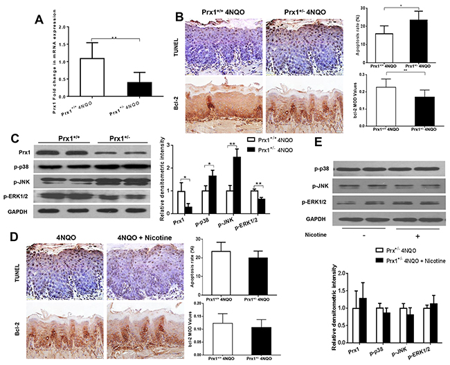 Figure 6: Effects of 4NQO and 4NQO + nicotine on Prx1, apoptosis and MAPK in Prx1 knockdown (Prx1+/-) mice. (A) mRNAexpression of Prx1; (B) apoptosis detected by TUNEL and Bcl-2 expression in animals treated with 4NQO; (C) protein expression of Prx1, p-p38, p-JNK and p-ERK1/2 in animals treated with 4NQO; (D) apoptosis detected by TUNEL and Bcl-2 expression in Prx1 knockdown mice treated with 4NQO or 4NQO plus nicotine; and (E) protein expression of Prx1, p-p38, p-JNK and p-ERK1/2 in Prx1 knockdown mice treated with 4NQO or 4NQO plus nicotine. The values are expressed as mean; bars, ± SE. * P < 0.05; ** P < 0.01.