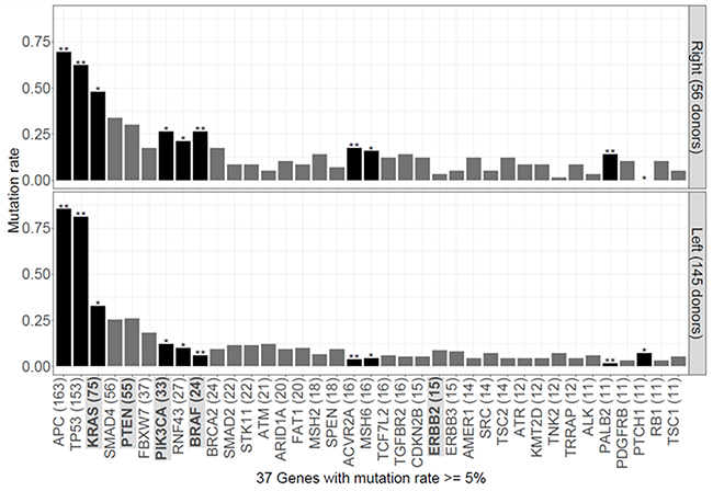 CGS has ability to detect numerous actionable mutations that can guide new treatment strategies. In this analysis, a novel finding was PALB2 mutations occurring significantly more frequent in RCRC than LCRC. PALB2 is a DNA maintenance gene, where the encoded protein binds to and colocalizes with BRCA2 in nuclear foci, and plays a role of tumor suppression [27]. In CRC, the significance of PALB2 mutations has not been elucidated, and this is the first report regarding PALB2 mutations in relation to CRC sidedness. PALB2 mutations are considered to be actionable, and are a biomarker for response to Poly (ADP-ribose) polymerase (PARP) inhibitors in pancreatic (ClinicalTrials.gov Identifier: NCT03140670) and prostatic (ClinicalTrials.gov Identifier: NCT02952534) cancers. In this analysis, we found 8 of 56 (14%) RCRCs had PALB2 mutations compared with 3 of 145 (2%) LCRCs. Thus, targeting PALB2 may represent a future treatment strategy for RCRC.