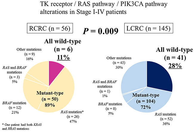 Genetic alterations in TK receptors and the RAS and PI3K pathways in RCRC and LCRC