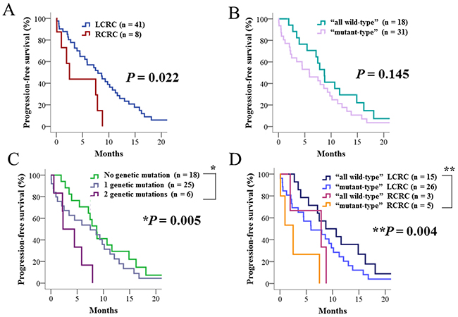 Among the 49 patients treated with anti-EGFR therapy in addition to cytotoxic chemotherapy, patients with RCRC showed significantly worse progression-free survival (PFS) than patients with LCRC (P = 0.022; Figure 4A). Regarding the 12 genes associated with anti-EGFR therapy resistance in these 49 patients, 18, 25, and 6 patients had 0, 1 and 2 genetic alterations, respectively. No significant difference was observed in PFS between “all wild-type” and “mutant-type” (Figure 4B), but the six patients with two genetic alterations showed significantly worse PFS than patients with no genetic mutations (P = 0.005; Figure 4C). After stratification by primary tumor sidedness, we found BRAF mutations were significantly associated with RCRC (P = 0.047; Table 4). When the 49 patients were classified into four groups according to primary tumor sidedness and genetic alterations associated with anti-EGFR therapy resistance, “mutant-type” RCRC showed a significantly worse PFS compared with “all wild-type” LCRC (P = 0.004; Figure 4D).