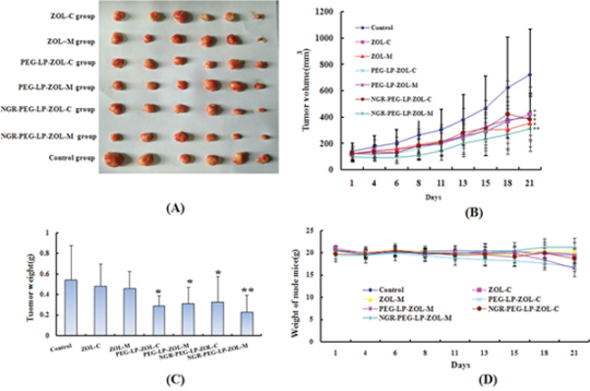 Figure 2: Effect on anti-tumor activity in vivo. Six weeks-old female BALB/c mice bearing 300 mm3 MDA-MB-231 tumors were randomly divided into the following groups (6 mice/group): (1) Control group (physiological saline, i.v.), (2) ZOL-C (0.1 mg/kg, i.v., q7d), (3) ZOL–M (ZOL equivalent dose of 0.025 mg/kg, i.v., q2d), (4) PEG-LP-ZOL-C (ZOL equivalent dose of 0.1 mg/kg, i.v., q7d), (5) PEG-LP-ZOL-M (ZOL equivalent dose of 0.025 mg/kg, i.v., q2d), (6) NGR-PEG-LP-ZOL-C (ZOL equivalent dose of 0.1 mg/kg, i.v., q7d), (7) NGR-PEG-LP-ZOL-M (ZOL equivalent dose of 0.025 mg/kg, i.v., q2d). The total dose of ZOL in all therapy groups was 0.4 mg/kg. All drugs were administered after dissolving in water for injection. (A) Photographs of representative tumors from each treatment group after mice was sacrificed. (B) Tumor growth was monitored three times a week by caliper measurement. Results were presented as mean ± standard deviation (SD), (n =6). (**p < 0.01 vs control group; *p < 0.05 vs control group). (C) Examination of tumor weight at the time of sacrifice and 21 days post-inoculation. Results were presented as mean ± standard deviation (SD), (n =6). (**p < 0.01 vs control group; *p < 0.05 vs control group). (D) Graph of nude mice weight change in the experimental period.