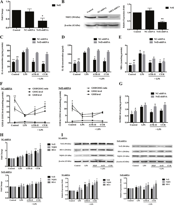 Figure 2: Protective effects of ATR-II on LPS-induced inflammation and oxidative stress in MCF 10A cells. Nrf2 knockdown attenuated the mRNA (A) and protein expression (B) levels of Nrf2 in MCF 10A cells. Pretreatment with ATR-II reduced the LPS-induced IL-6 (C), IL-1β (D), MDA (E) and 8-OHdG (G) levels, and increased the ratios of GSH/GSSG (F) in the NC-shRNA MCF 10A cells, while the Nrf2 knockdown abolished these effects. ATR-II increased the mRNA (H) and protein expression (I) levels of Nrf2 and its downstream genes NQO1 and HO-1 in LPS-induced MCF 10A cells. Significantly different (A, B, H and I versus control group; C to G versus LPS group): *P<0.05 and **P<0.01 for NC-shRNA cells; #P<0.05 and ##P<0.01 for Nrf2-shRNA cells.