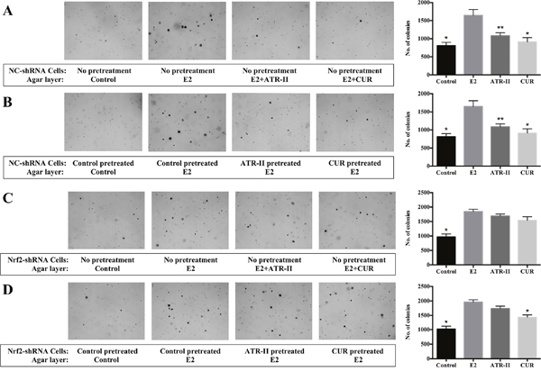 Figure 3: ATR-II inhibited anchorage-independent growth of MCF 10A cells, and Nrf2 knockdown attenuated these inhibitory effects. (A) NC-shRNA MCF 10A cells were plated in soft agar containing 0.1% DMSO (control), E2 (100 nM), E2 + ATR-II (50 μM) or E2 + CUR (20 μM) in 6-well plates for 21 days. (B) NC-shRNA MCF 10A cells were firstly treated with 0.1% DMSO (control), 50 μM ATR-II or 20 μM CUR 5 days, then the cells were transferred and grown in agar for additional 21 days only with presence of E2. (C) Nrf2-shRNA MCF 10A cells were plated in soft agar containing 0.1% DMSO (control), E2 (100 nM), E2 + ATR-II (50 μM) or E2 + CUR (20 μM) in 6-well plates for 21 days. (D) Nrf2-shRNA MCF 10A cells were firstly treated with 0.1% DMSO (control), 50 μM ATR-II or 20 μM CUR 5 days, then the cells were transferred and grown in agar for additional 21 days only with presence of E2. The colonies were counted under a microscope and analyzed using ImageJ software. Representative images of each group under a microscope are shown in the left panel. Graphical data are presented as the mean ± S.D. of triplicate results from three independent experiments. Significantly different (versus E2 group): *P<0.05 and **P<0.01.