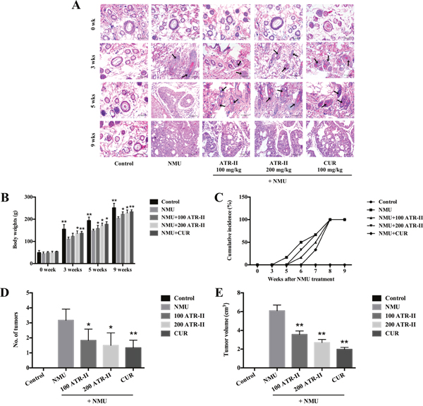Figure 4: Chemopreventive effects of ATR-II on NMU-induced tumor progression in SD rats. After pretreatment with control (vehicle), ATR-II (100 mg/kg and 200 mg/kg) and CUR (100 mg/kg) for 3 days, the rats were intraperitoneal injected with single dose of NMU (75 mg/kg), and then the rats were continued to treat with vehicle, ATR-II and CUR for the indicated times. (A) H & E staining in the mammary glands of NMU-induced rats. Mammary gland sections from each experimental group were stained with HE. Representative sections from these groups are shown (Scale bar, 50 μm). (B) Body weights of rats in the 7 groups during the experimental period. (C) Tumor incidence of palpable NMU-induced mammary tumor appearance during the experimental period. (D) Number of tumors at the end of experiment. (E) Average tumors volume at the end of experiment. Values are presented as mean ± S.D. (n=6). Significantly different (versus NMU-treated group): *P<0.05 and **P<0.01.