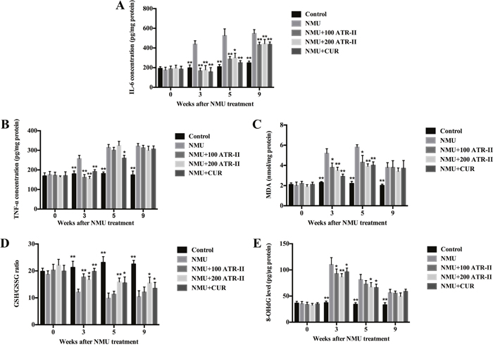 Inflammatory and oxidative injuries are closely related to the process of multi-stage carcinogenesis. To further elucidate the underlying mechanisms of inhibitory effects of ATR-II on mammary tumor progression, we measured the inflammatory and oxidative levels in rats. As shown in Figure 5, the levels of IL-6, TNF-α and 8-OHdG in rat mammary glands were detected by ELISA assay, and levels of MDA and GSH were analyzed by commercial assay kit in this study. NMU treatment increased IL-6, TNF-α, 8-OHdG and MDA levels, and decreased GSH/GSSG ratio in the mammary glands from 3 weeks of treatment. At 3 weeks, significant reduction of IL-6, TNF-α, 8-OHdG and MDA levels, and increment of GSH/GSSG ratio were observed in response to ATR-II and CUR administration. At 5 weeks, decreased IL-6, 8-OHdG and MDA levels, and increased GSH/GSSG ratio were observed (P<0.05). At 9 weeks, the level of IL-6 was significantly decreased (P<0.01), and level of GSH/GSSG ratio was significantly escalated in ATR and CUR groups when compared with NMU group (P<0.05). Thus, ATR-II abated proinflammatory cytokines (TNF-α and IL-6), reduced oxidative markers (MDA and 8-OH-dG) and increased GSH/GSSG ratio in the mammary glands, which suggested that ATR-II had anti-inflammatory and antioxidant activities in the NMU-induced rat breast cancer model.