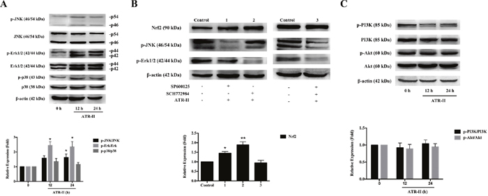Figure 7: Effects of ATR-II on the phosphorylation of JNK/ERK/p38 MAPK and PI3K/Akt signaling pathways. (A) MCF 10A cells were treated with ATR-II (50 μM) for 12 and 24 h. (B) Effects of SP600125 and SCH772984 on Nrf2 expression. MCF 10A cells were treated with ATR-II (50 μM) with or without the presence of SP600125 and SCH772984 for 24 h as indicated. (C) Effects of ATR-II on the expression and phosphorylation of PI3K and Akt. MCF 10A cells were treated with ATR-II (50 μM) for 12 and 24 h. The control group is represented by cells incubated with vehicle (0.1% DMSO). Values are presented as mean ± S.D. (n=3). Significantly different (versus control group): *P<0.05 and **P<0.01.