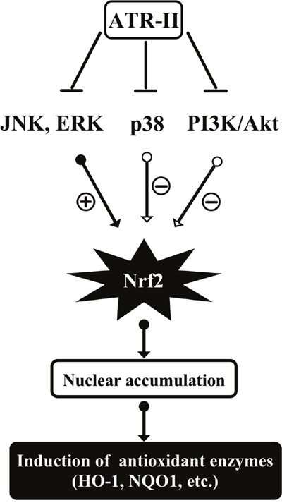 In conclusion, ATR-II activated JNK and ERK signaling pathways and facilitated the release of Nrf2 for nuclear translocation, thus inducing the expression of antioxidant enzymes (HO-1 and NQO1) in MCF 10A cells. The proposed mechanisms of ATR-II induced activation of Nrf2 and subsequent expression of antioxidant enzymes are shown in Figure 8, and these results add further evidence of the molecular mechanisms that allow ATR-II to exert protective effects and its potential role as a chemopreventive agent in mammary carcinogenesis.