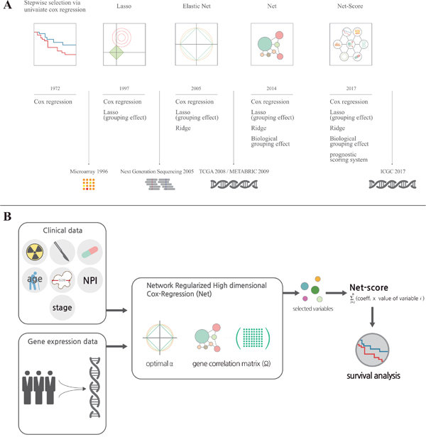 Figure 1: Development of statistical methods for prognostic prediction of cancer patients. (A) It shows a brief history of the development of statistical methods for variable selection on a timeline. For more details, please refer to the description in “Results”. (B) It is a graphical summary for development of the Net-based scoring system. Total variables including clinical and genetic factors were assessed in Network Regularized High dimensional Cox-Regression (Net) with optimal parameters (gene expression correlation: α and gene network correlation: Ω). After variable selection, we generated a Net-score using estimated regression coefficient and variables ∑(coefficient X value of variable) from Net results.