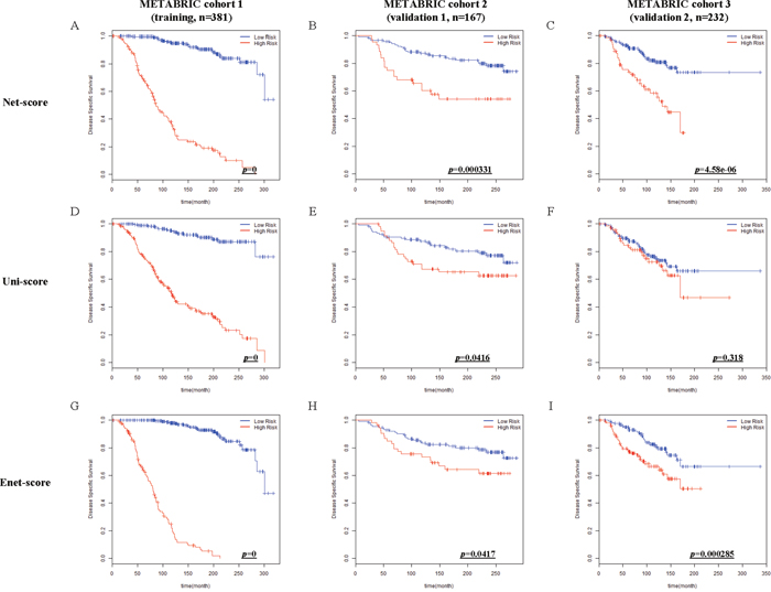 Figure 2: Kaplan-Meier estimates of survival of breast cancer patients according to the risk scores (Net-score, Uni-score, and Enet-score). Disease-specific survival (DSS) in METABRIC cohort 1 (training), METABRIC cohort 2 and 3 (validation 1 and 2) were examined by Net-score (A, B and C), Uni-score (D, E and F), or Enet-score (G, H and I). p-value was calculated by log-rank test.