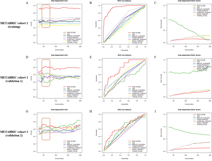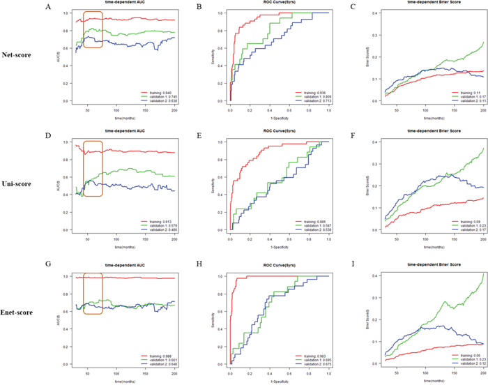 Figure 3: Time-dependent area under the curve (AUC), time-dependent Brier score curve and receiver operating characteristic (ROC) curve at 5 years according to risk scores (Net-, Uni- and Enet-score) in the training and validation sets. Time-dependent AUC, time-dependent Brier score curve and ROC curve at 5 years in METABRIC cohort 1 (training, red), METABRIC cohort 2 (validation 1, green), and METABRIC cohort 3 (validation 2, blue) cohorts according to Net-score (A, B and C), Uni-score (D, E and F), and Enet-score (G, H and I). C-indexes are described at the bottom right position of A, D and G. AUC value at 5 years is described at the bottom right position of B, E, and H. Brier scores are described at the bottom right position of C, F and I.